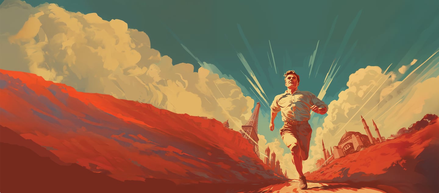 The cover design was inspired by both Soviet propaganda art and early 20th-century travel posters, done in the three sepia-toned colours of the French flag. It depicts a man on an endless run through places featured in the novel.